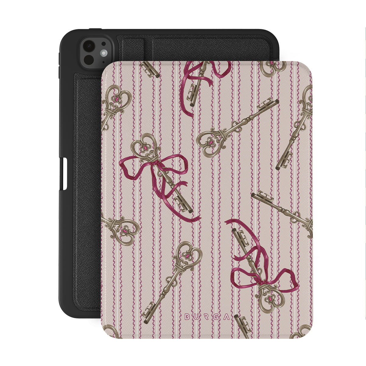 Kenmerken van dit design: antieke sleutels, strikken, roze linten, gestreepte achtergrond