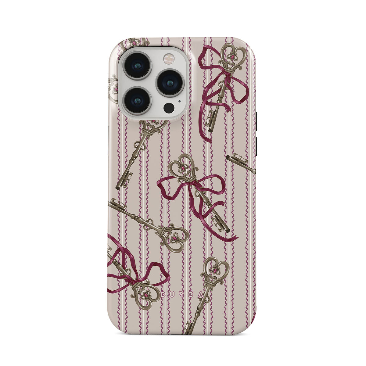 Kenmerken van dit design: antieke sleutels, strikken, roze linten, gestreepte achtergrond