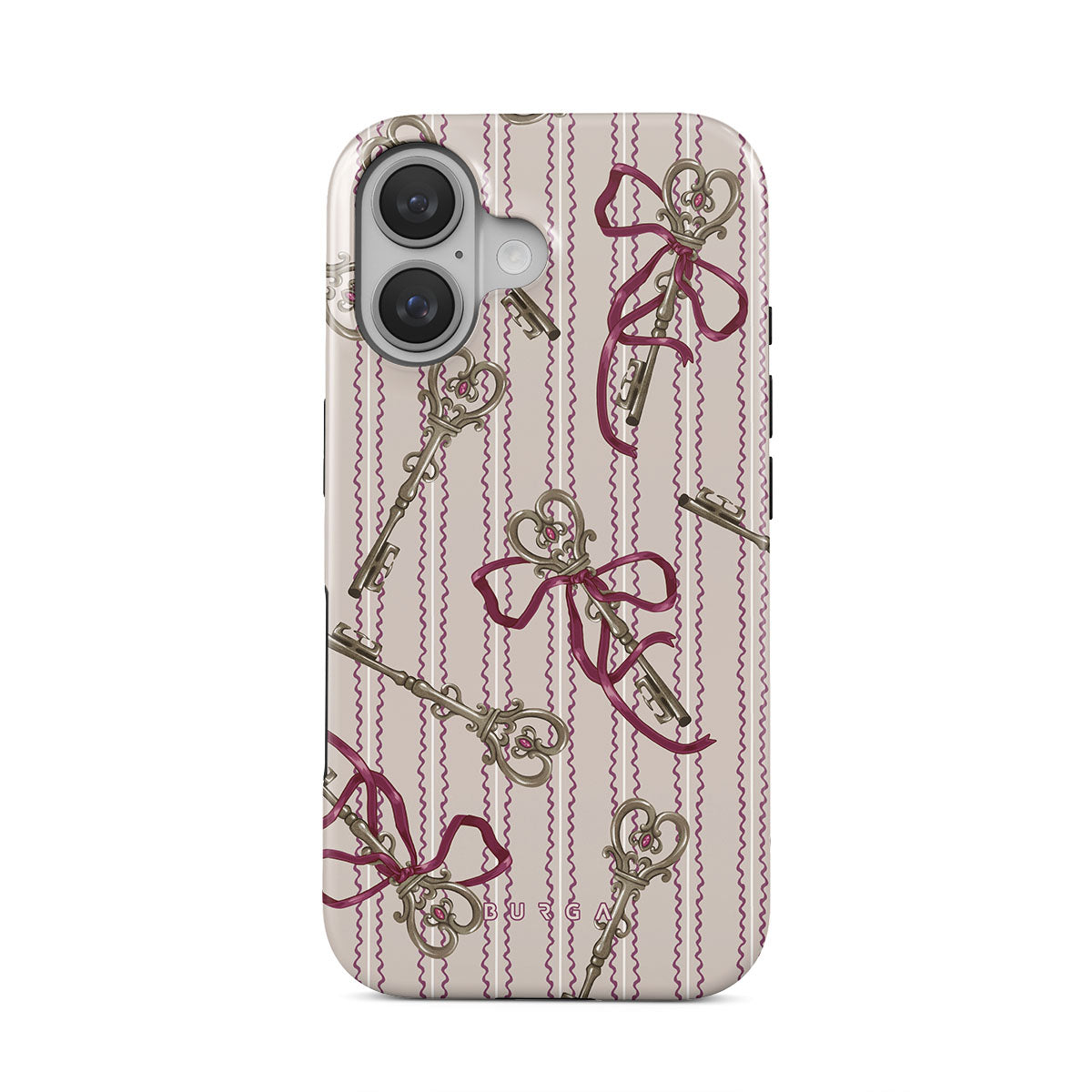 Kenmerken van dit design: antieke sleutels, strikken, roze linten, gestreepte achtergrond
