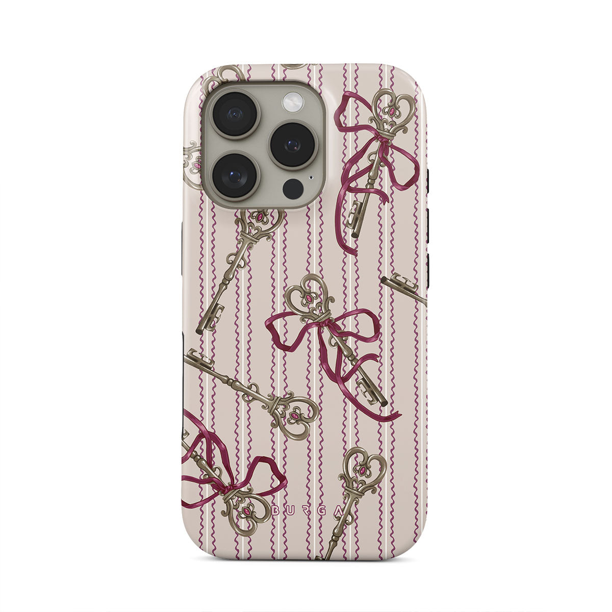 Kenmerken van dit design: antieke sleutels, strikken, roze linten, gestreepte achtergrond