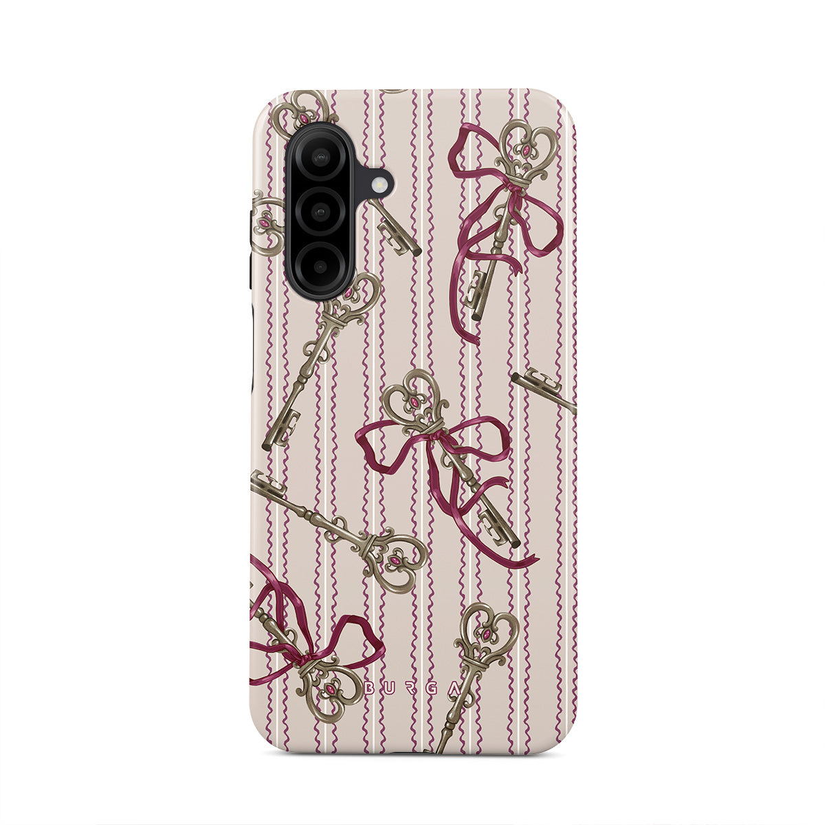 Kenmerken van dit design: antieke sleutels, strikken, roze linten, gestreepte achtergrond