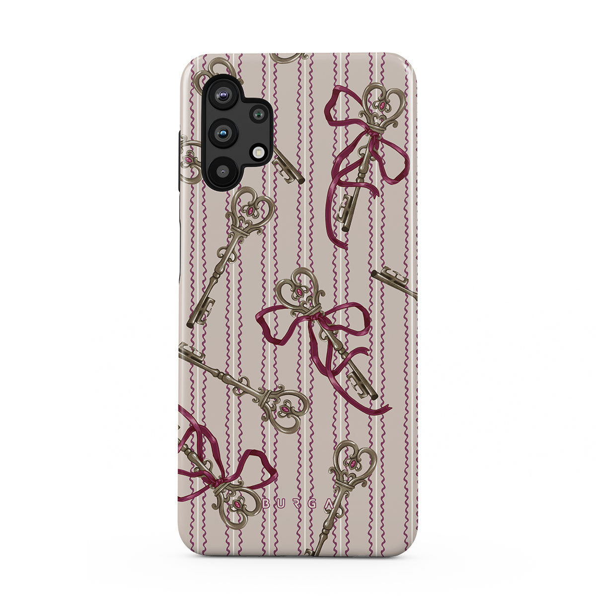 Kenmerken van dit design: antieke sleutels, strikken, roze linten, gestreepte achtergrond