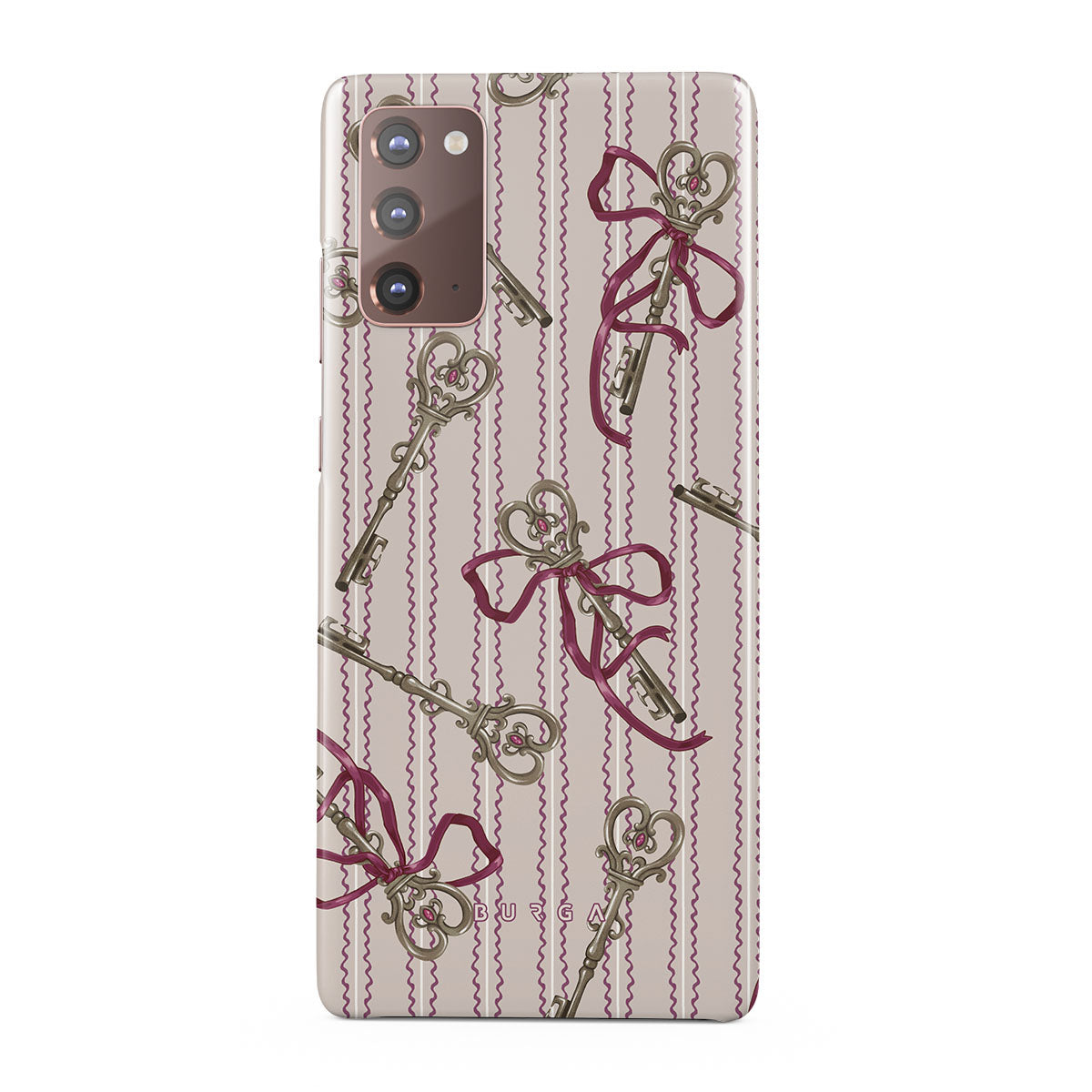 Kenmerken van dit design: antieke sleutels, strikken, roze linten, gestreepte achtergrond