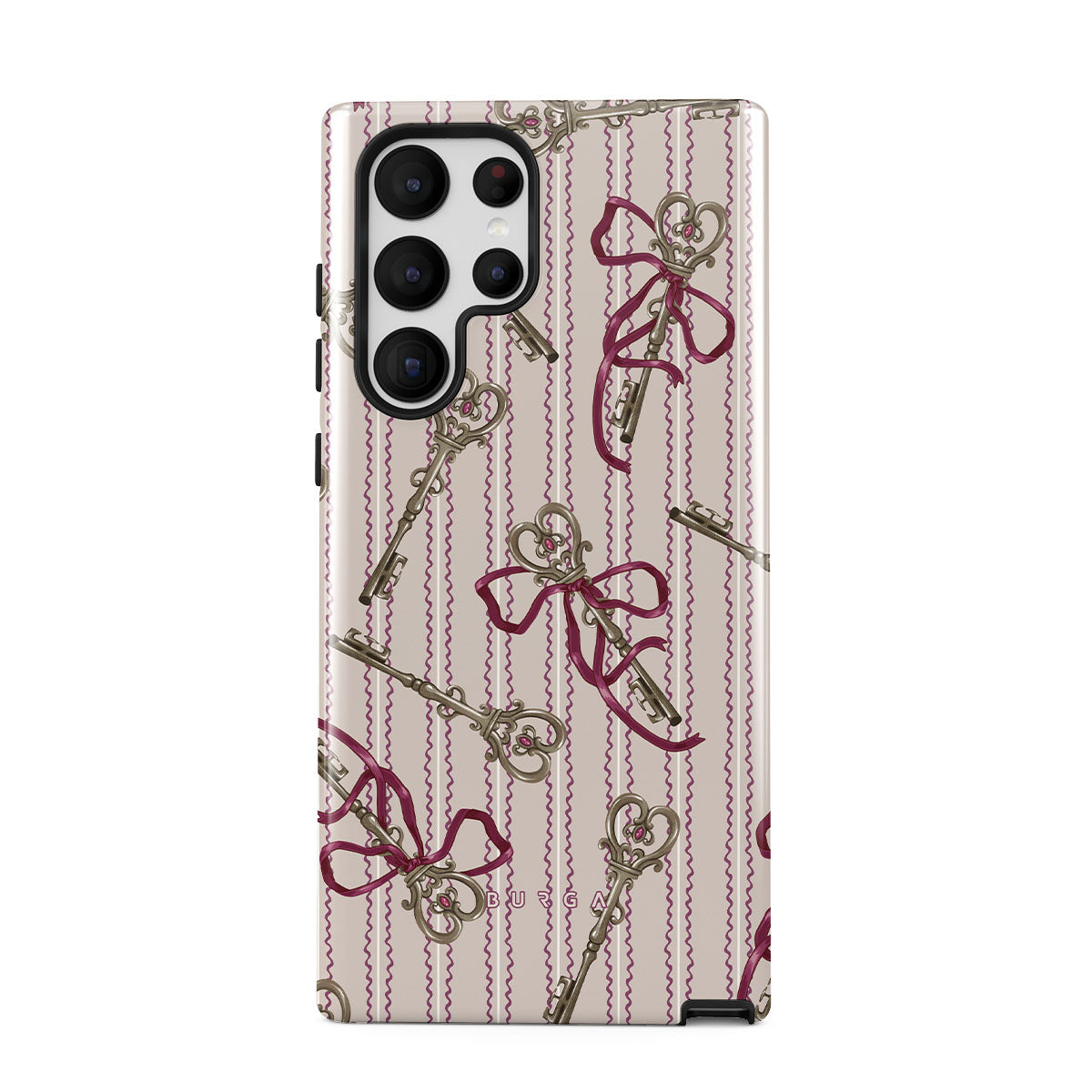 Kenmerken van dit design: antieke sleutels, strikken, roze linten, gestreepte achtergrond
