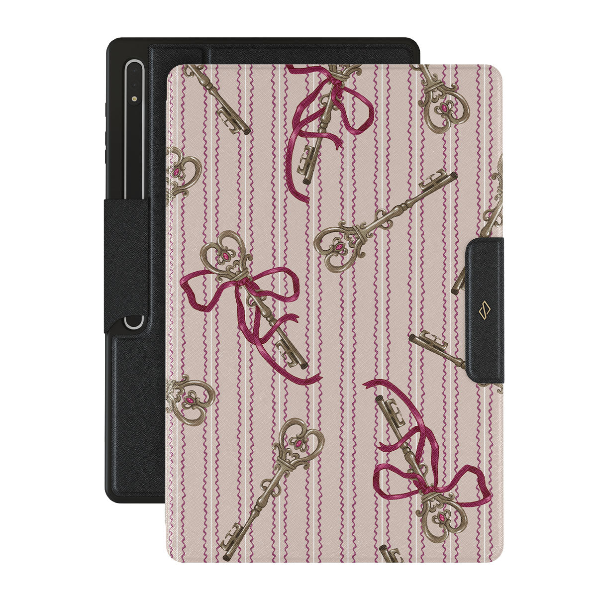 Kenmerken van dit design: antieke sleutels, strikken, roze linten, gestreepte achtergrond