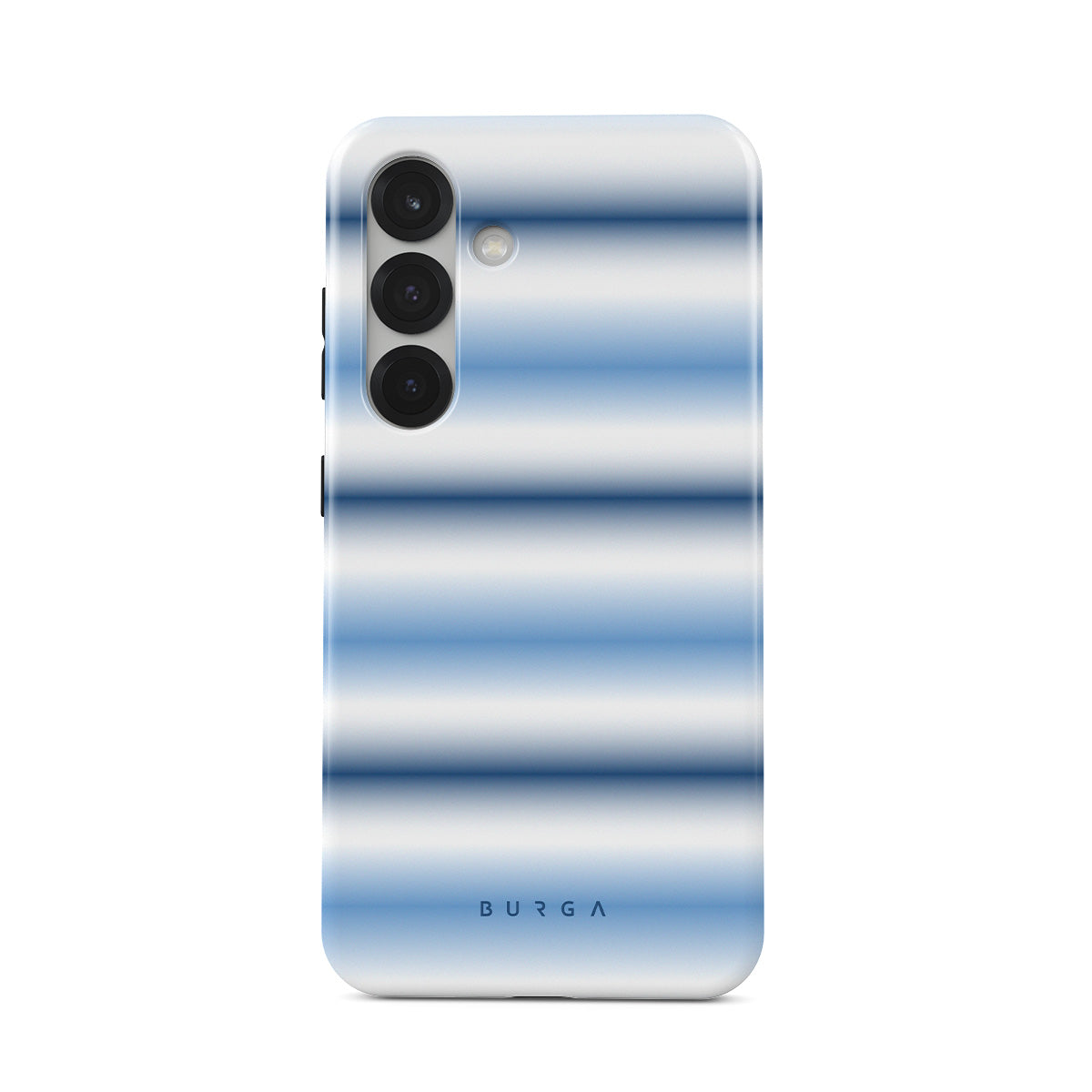 Kenmerken van dit design: zacht blauw kleurverloop, horizontale witte en blauwe strepen
