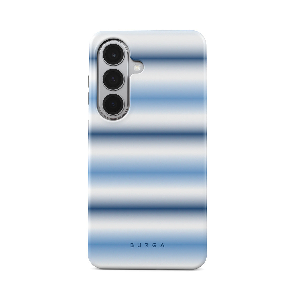 Kenmerken van dit design: zacht blauw kleurverloop, horizontale witte en blauwe strepen