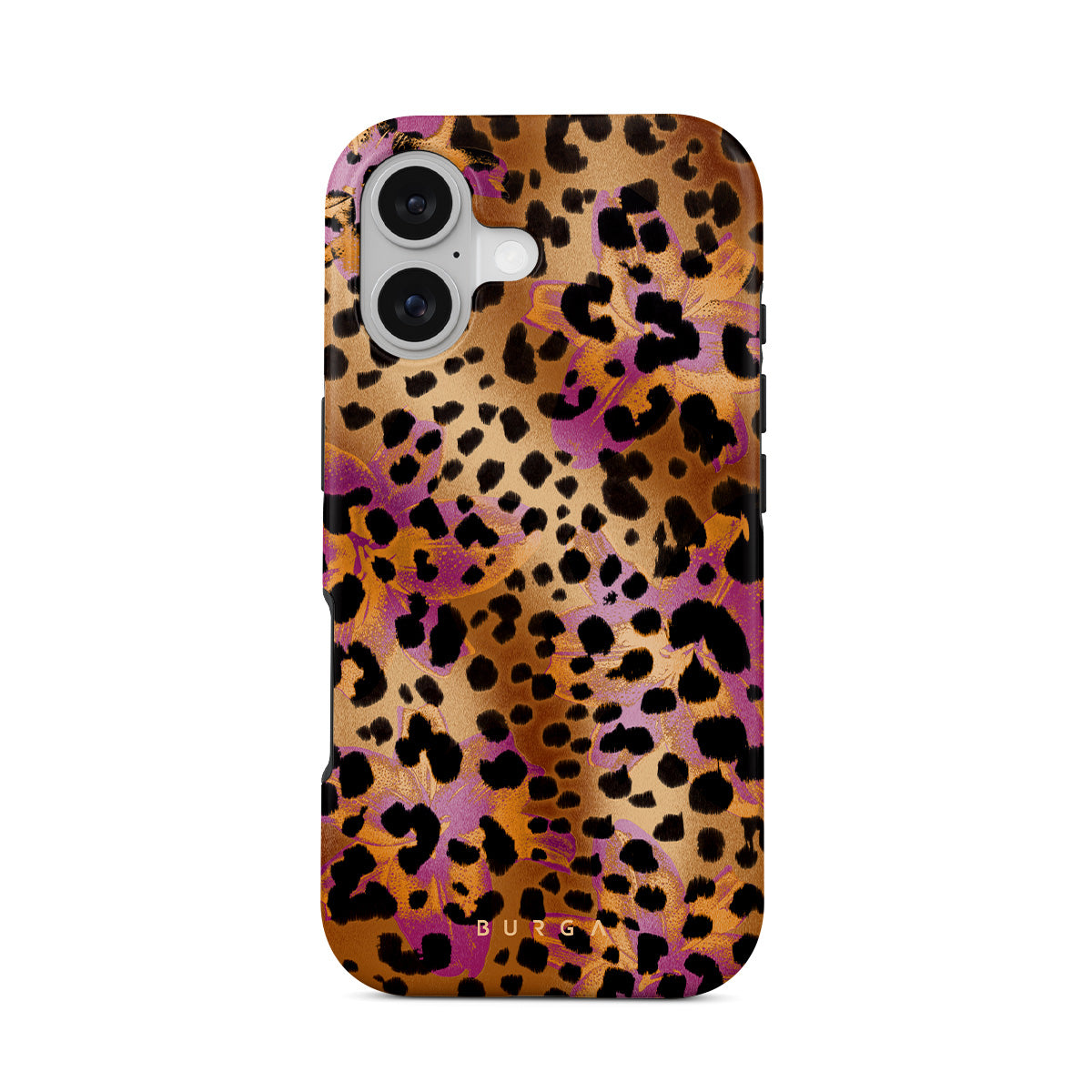 Kenmerken van dit design: luipaardprint, bruin, oranje, paars, dierenprint.
