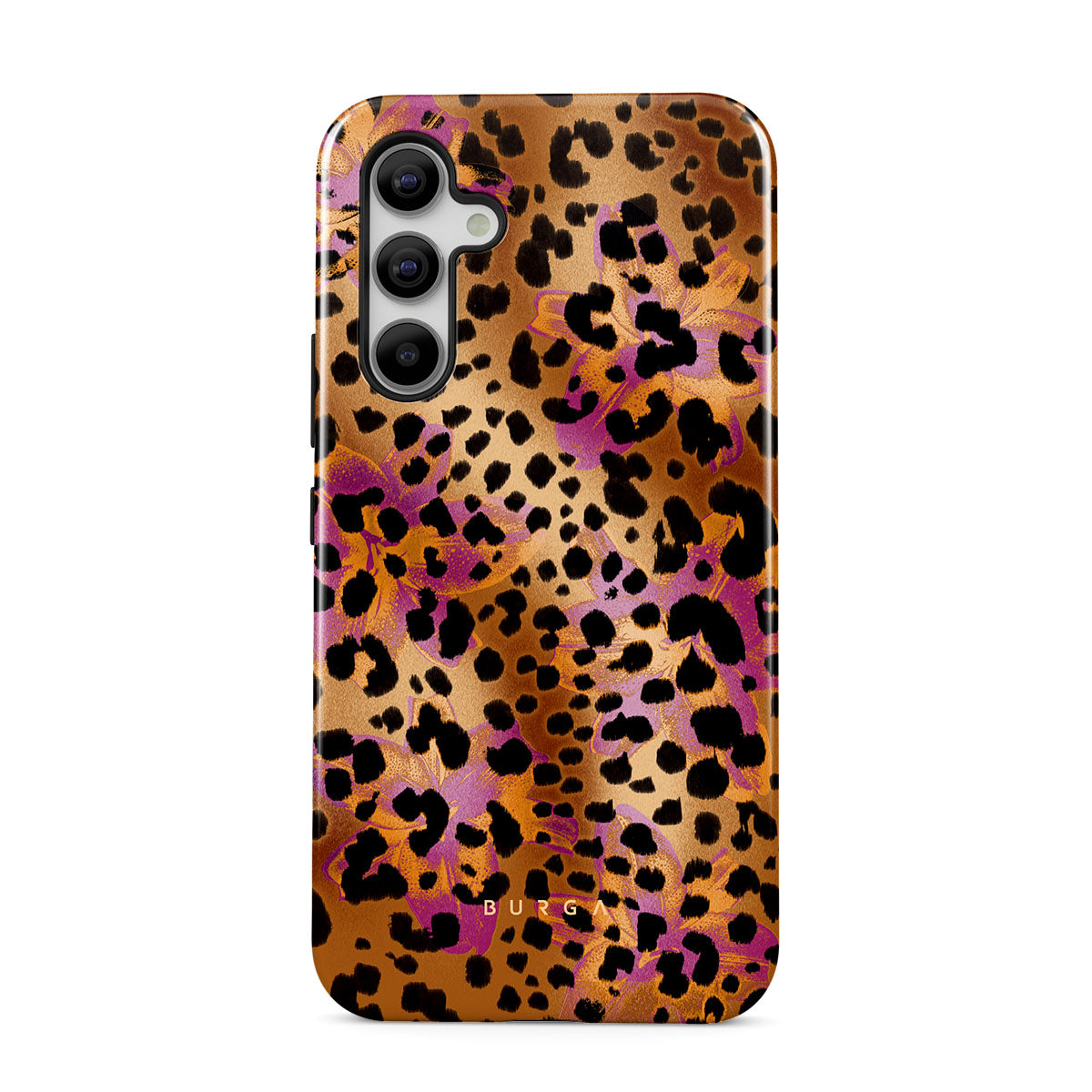 Kenmerken van dit design: luipaardprint, bruin, oranje, paars, dierenprint.