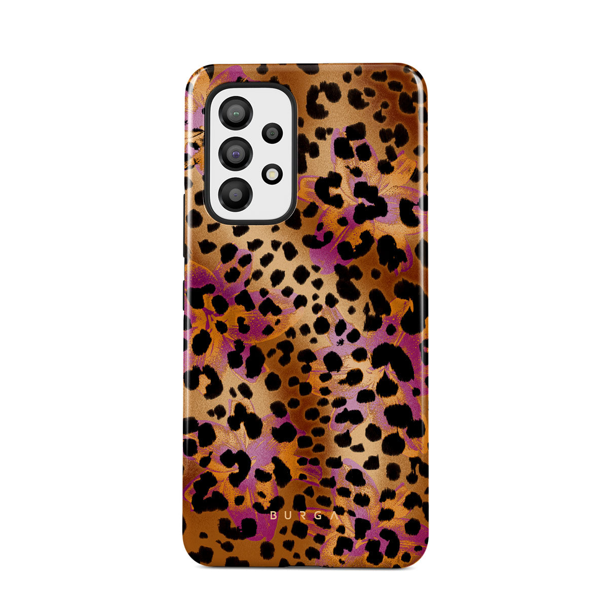 Kenmerken van dit design: luipaardprint, bruin, oranje, paars, dierenprint.