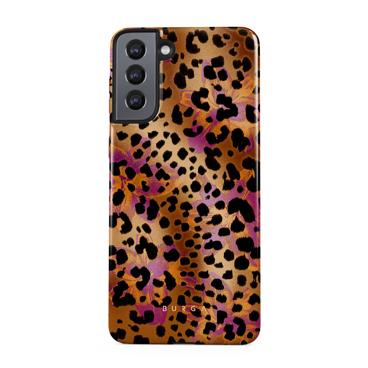 Kenmerken van dit design: luipaardprint, bruin, oranje, paars, dierenprint.