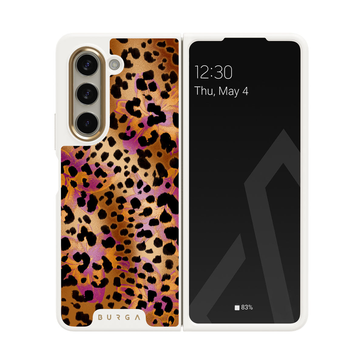 Kenmerken van dit design: luipaardprint, bruin, oranje, paars, dierenprint.