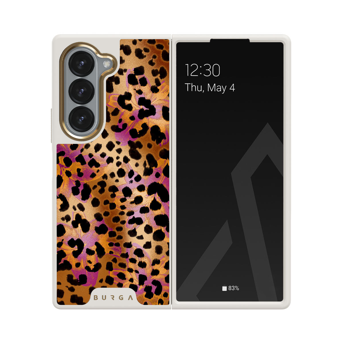 Kenmerken van dit design: luipaardprint, bruin, oranje, paars, dierenprint.