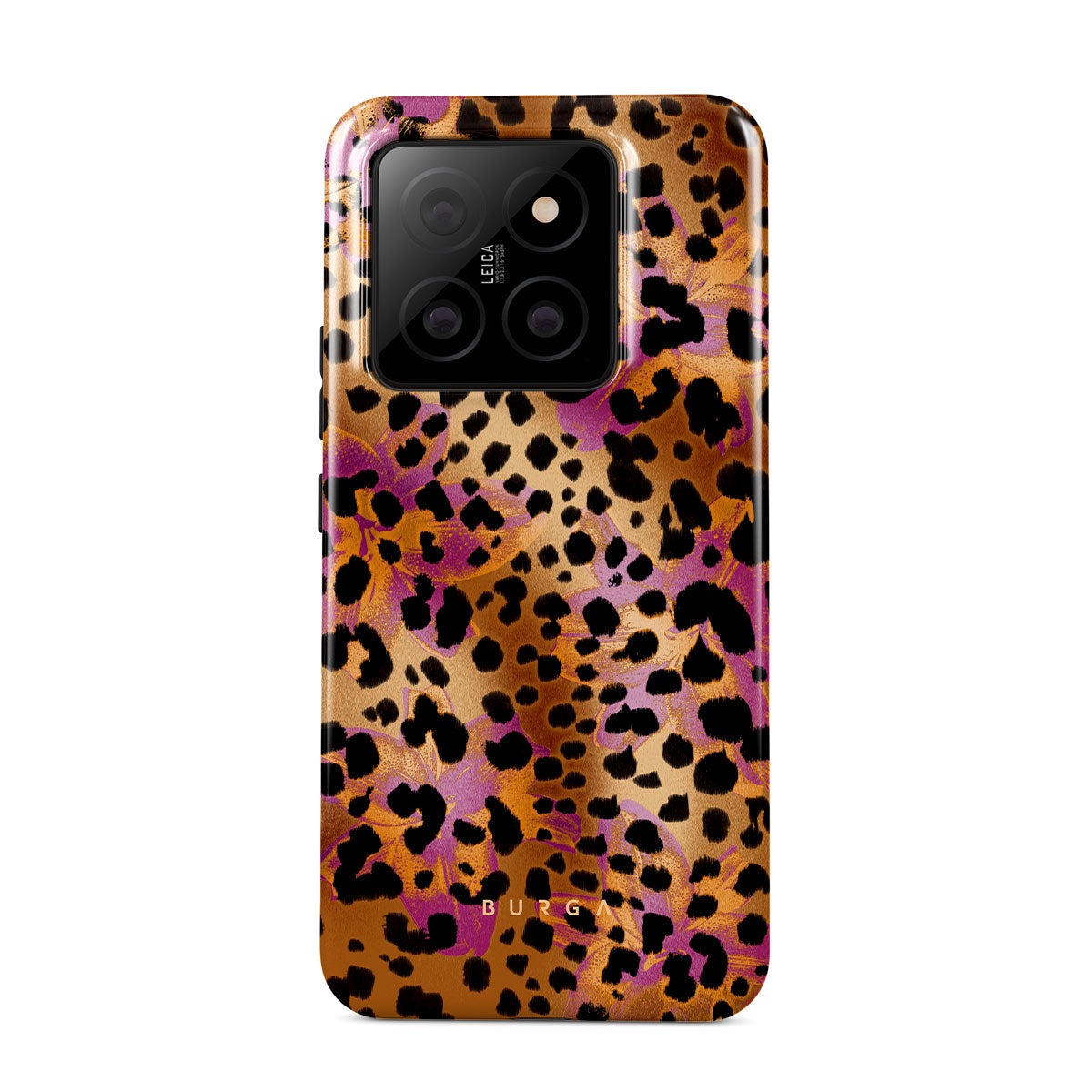 Kenmerken van dit design: luipaardprint, bruin, oranje, paars, dierenprint.
