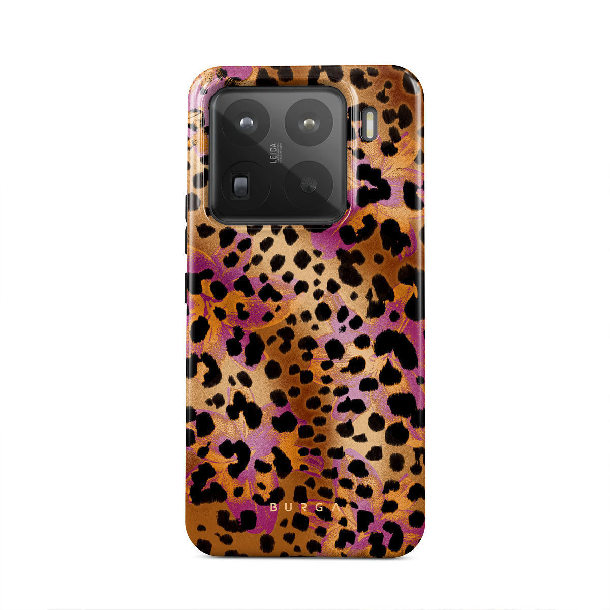 Kenmerken van dit design: luipaardprint, bruin, oranje, paars, dierenprint.