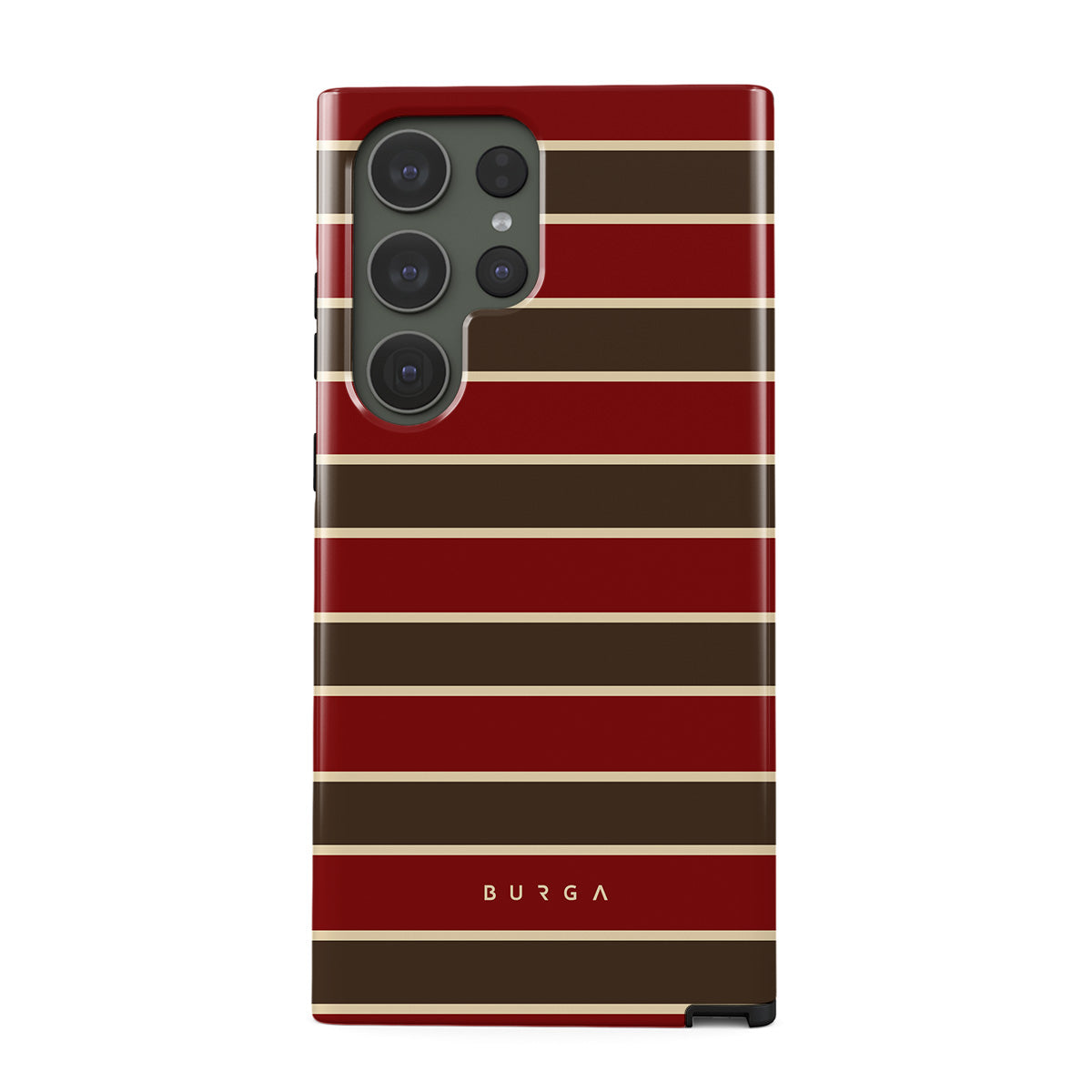 Kenmerken van dit design: rode strepen, bruine strepen, klassiek patroon, geometrisch patroon