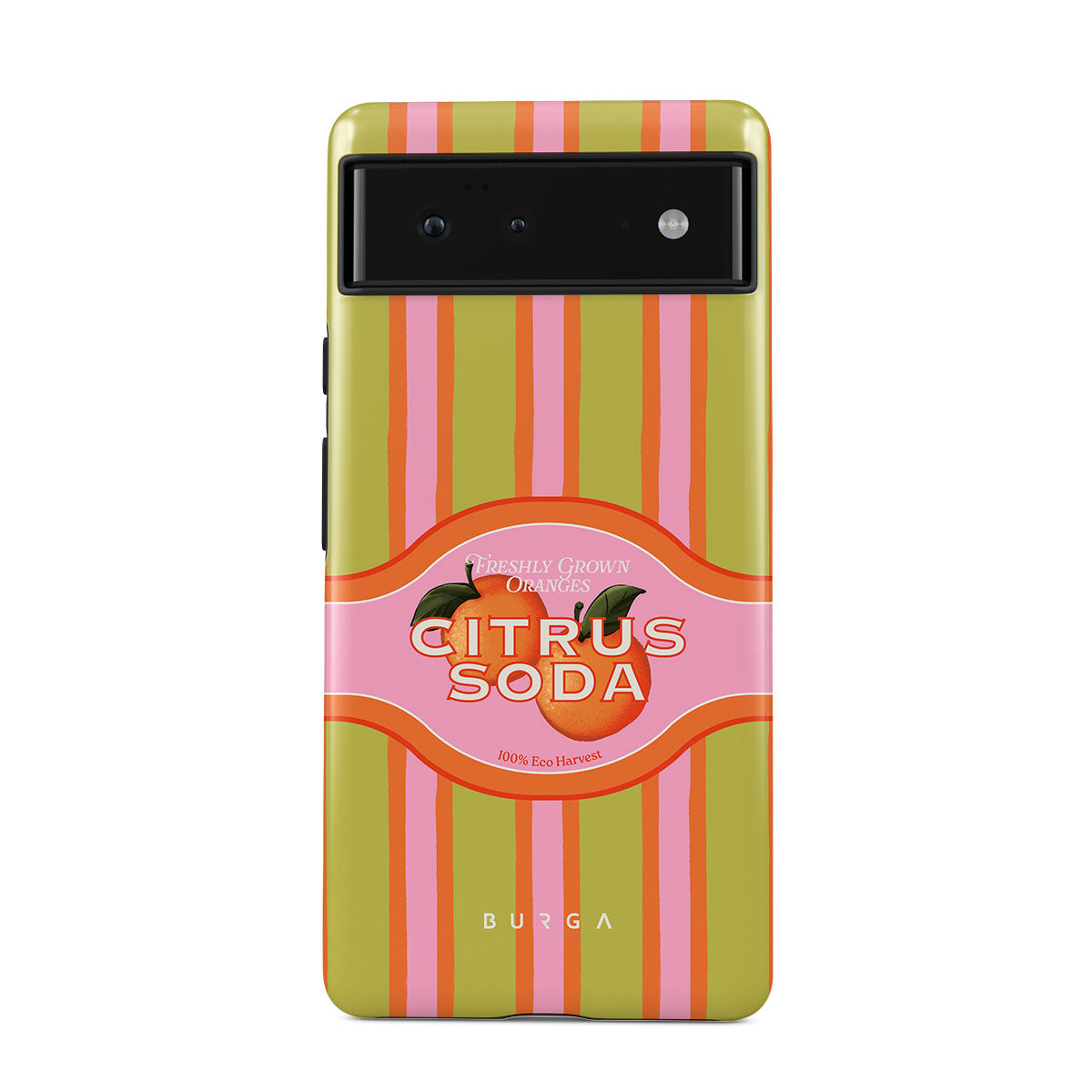 Kenmerken van dit design: levendige citrusstrepen, tekst, citrusplanten, mandarijnen, grapefruit