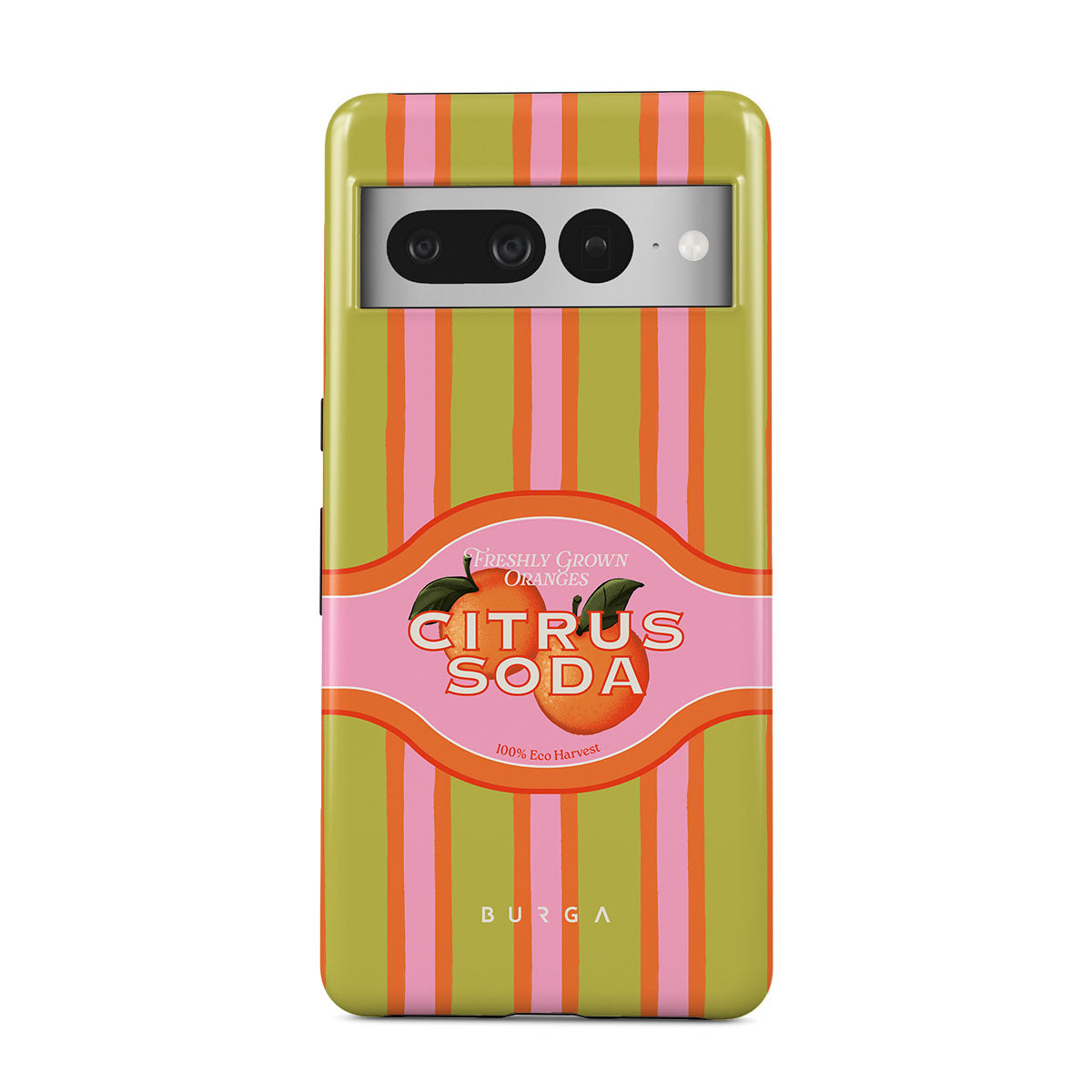 Kenmerken van dit design: levendige citrusstrepen, tekst, citrusplanten, mandarijnen, grapefruit