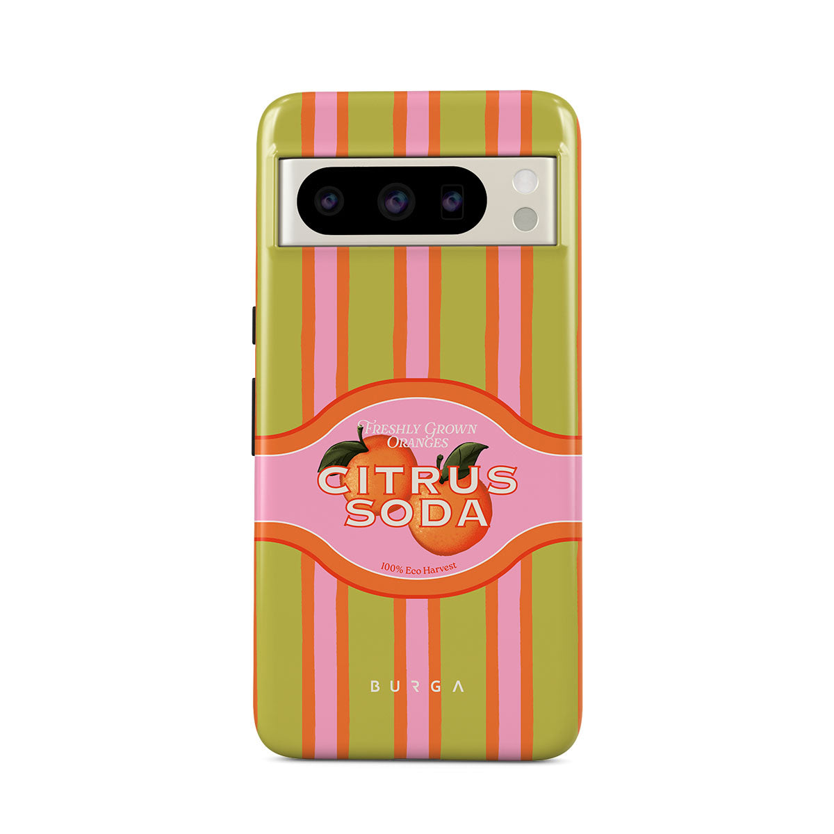Kenmerken van dit design: levendige citrusstrepen, tekst, citrusplanten, mandarijnen, grapefruit