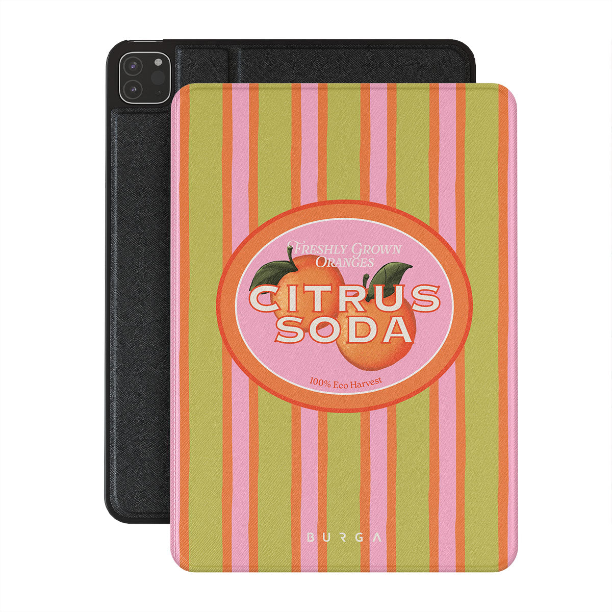 Kenmerken van dit design: levendige citrusstrepen, tekst, citrusplanten, mandarijnen, grapefruit