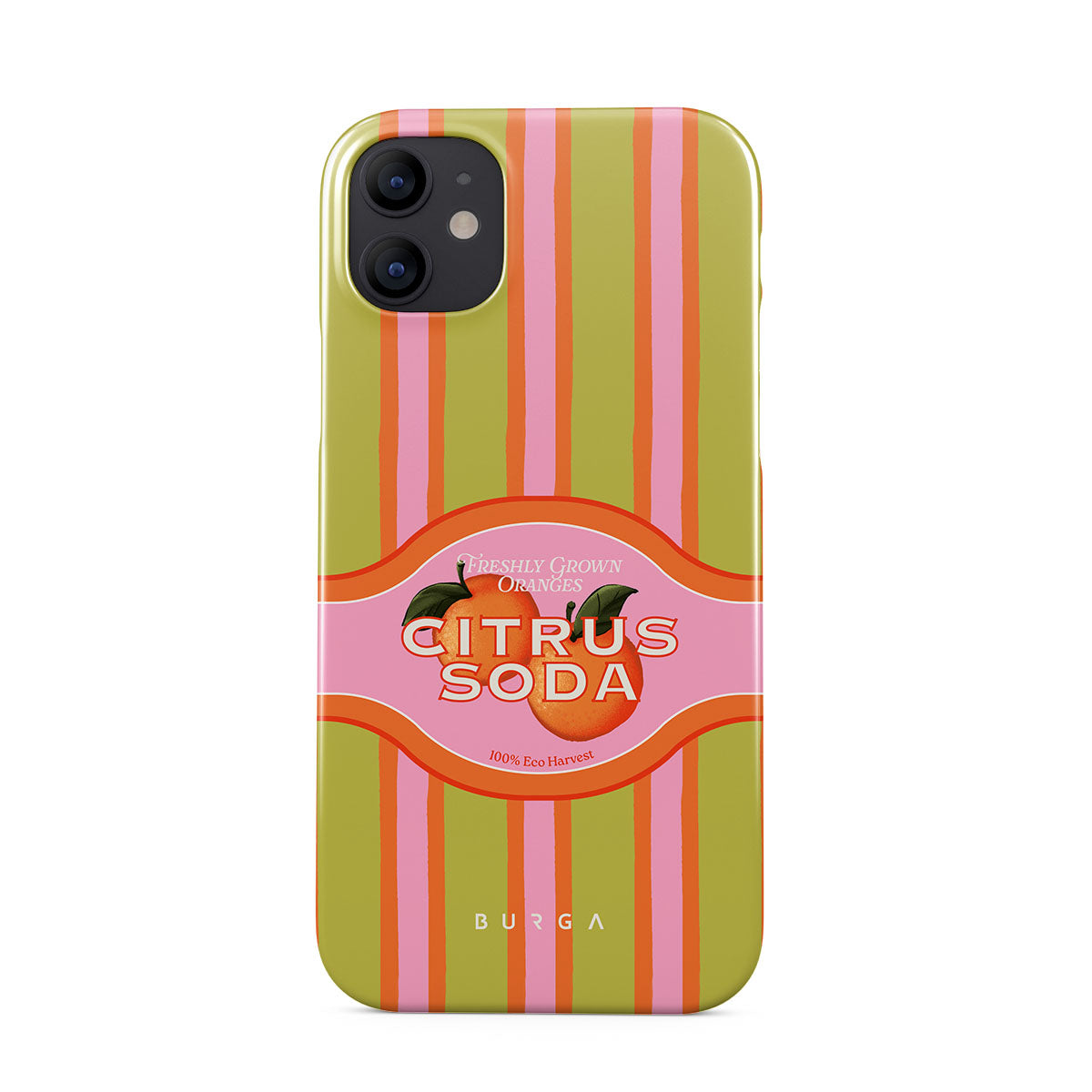 Kenmerken van dit design: levendige citrusstrepen, tekst, citrusplanten, mandarijnen, grapefruit