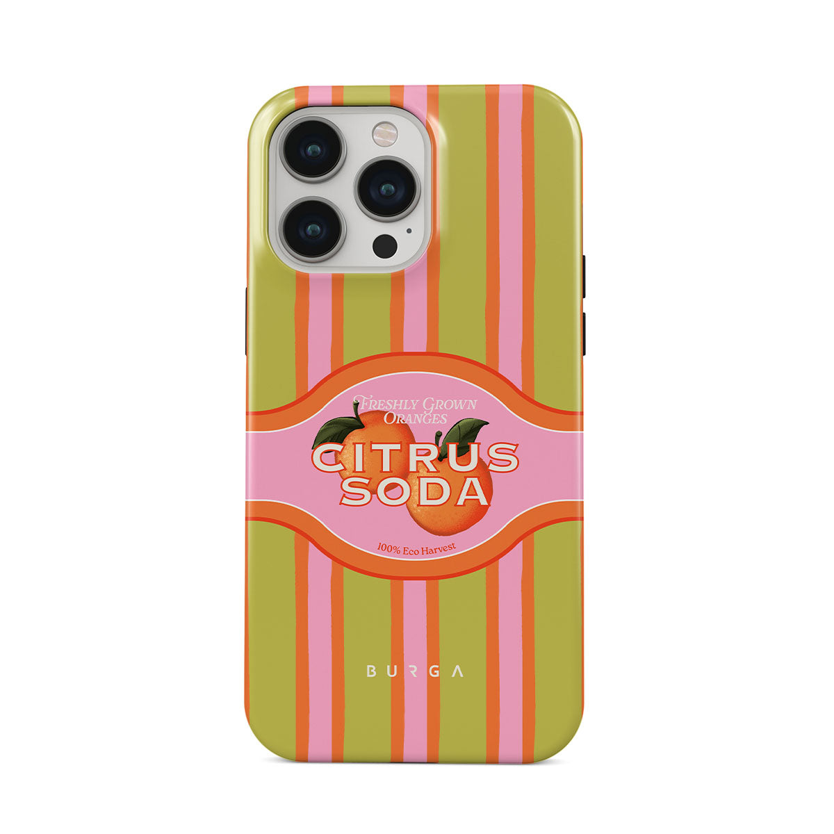 Kenmerken van dit design: levendige citrusstrepen, tekst, citrusplanten, mandarijnen, grapefruit