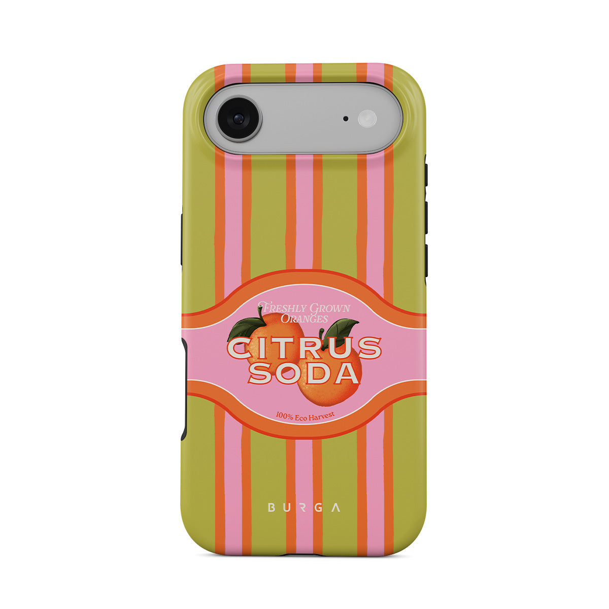 Kenmerken van dit design: levendige citrusstrepen, tekst, citrusplanten, mandarijnen, grapefruit