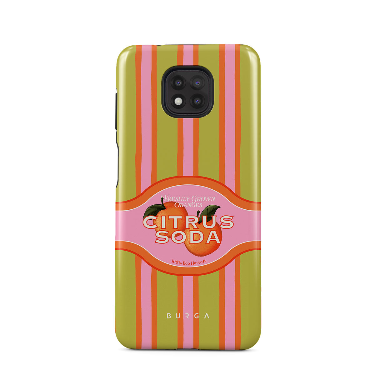 Kenmerken van dit design: levendige citrusstrepen, tekst, citrusplanten, mandarijnen, grapefruit
