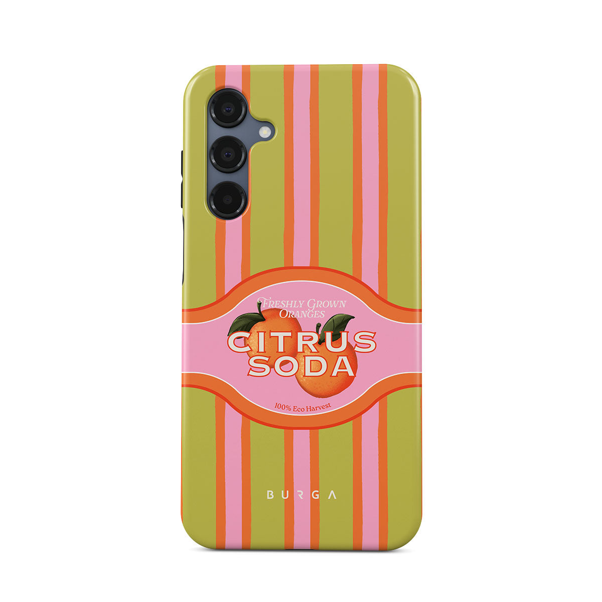 Kenmerken van dit design: levendige citrusstrepen, tekst, citrusplanten, mandarijnen, grapefruit