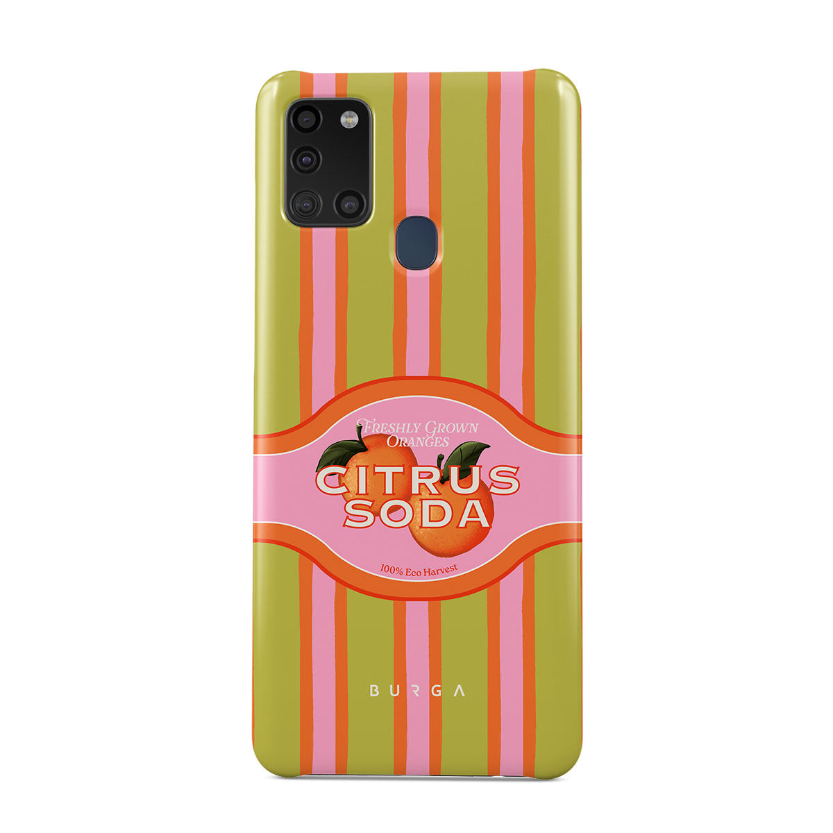 Kenmerken van dit design: levendige citrusstrepen, tekst, citrusplanten, mandarijnen, grapefruit