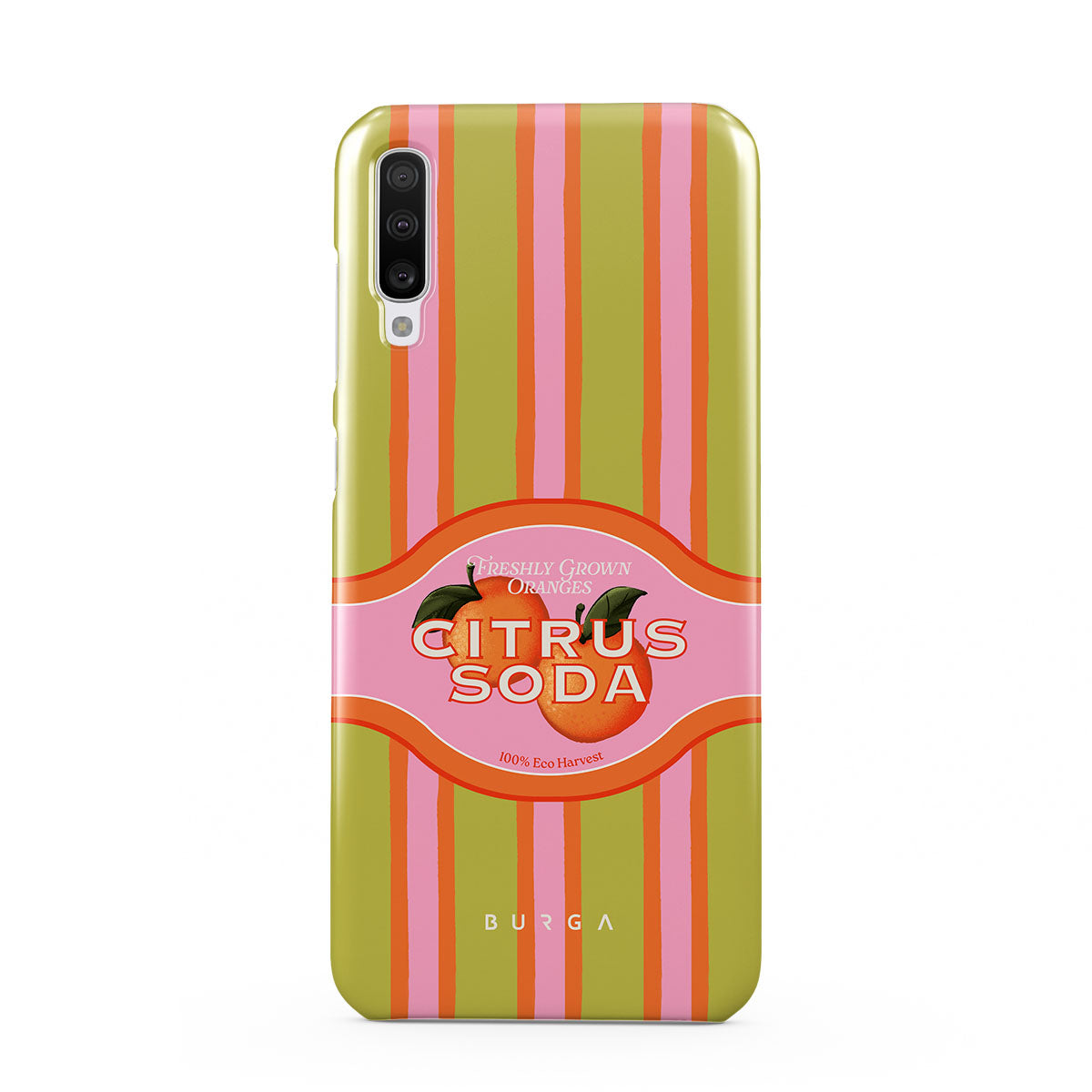 Kenmerken van dit design: levendige citrusstrepen, tekst, citrusplanten, mandarijnen, grapefruit