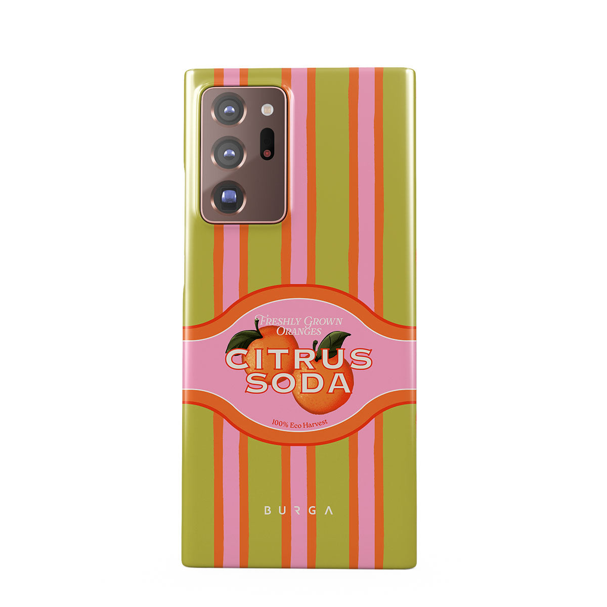 Kenmerken van dit design: levendige citrusstrepen, tekst, citrusplanten, mandarijnen, grapefruit