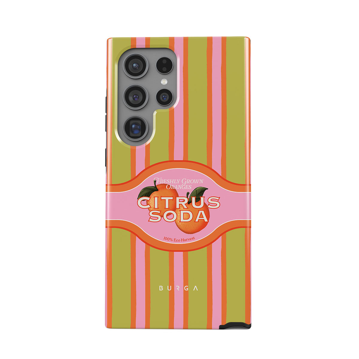 Kenmerken van dit design: levendige citrusstrepen, tekst, citrusplanten, mandarijnen, grapefruit