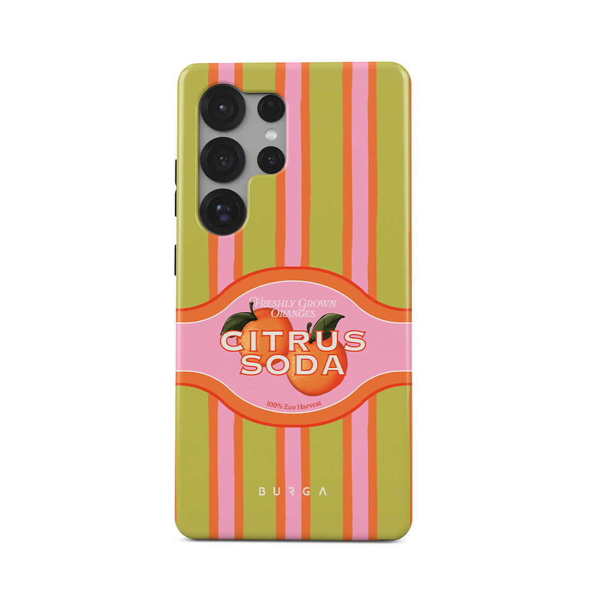 Kenmerken van dit design: levendige citrusstrepen, tekst, citrusplanten, mandarijnen, grapefruit