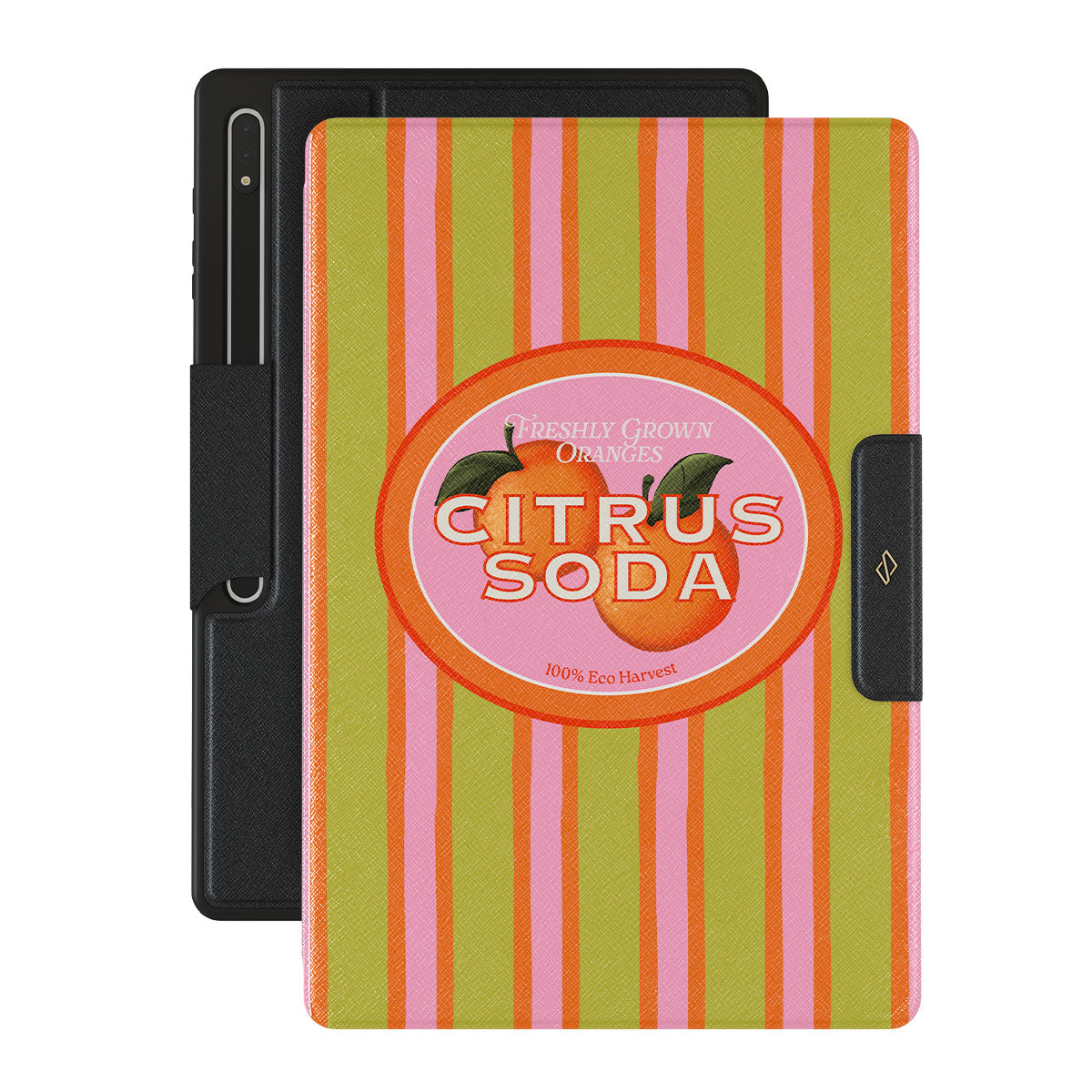 Kenmerken van dit design: levendige citrusstrepen, tekst, citrusplanten, mandarijnen, grapefruit