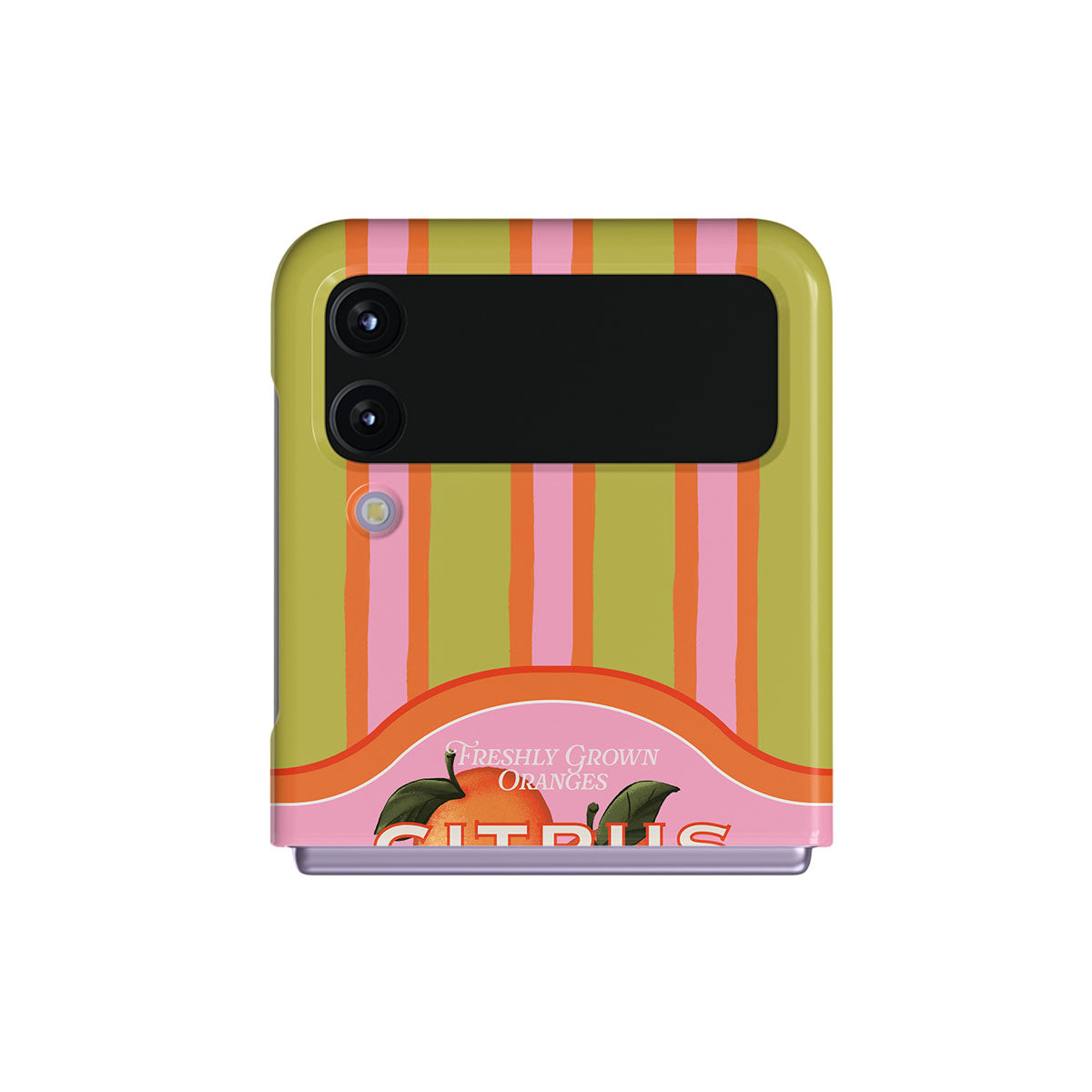 Kenmerken van dit design: levendige citrusstrepen, tekst, citrusplanten, mandarijnen, grapefruit