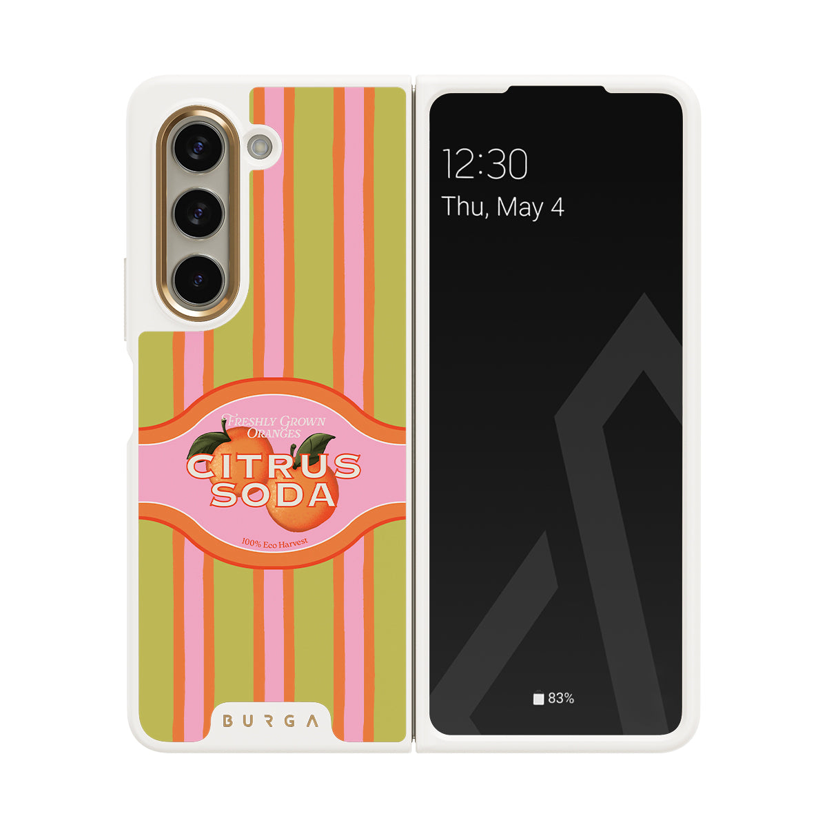 Kenmerken van dit design: levendige citrusstrepen, tekst, citrusplanten, mandarijnen, grapefruit