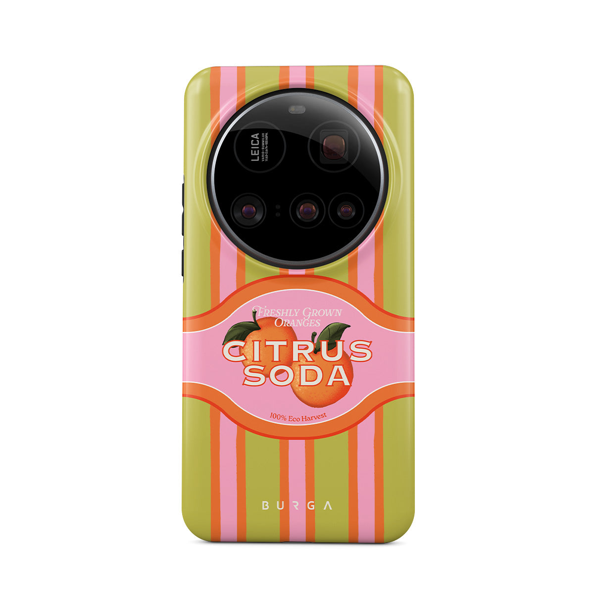 Kenmerken van dit design: levendige citrusstrepen, tekst, citrusplanten, mandarijnen, grapefruit